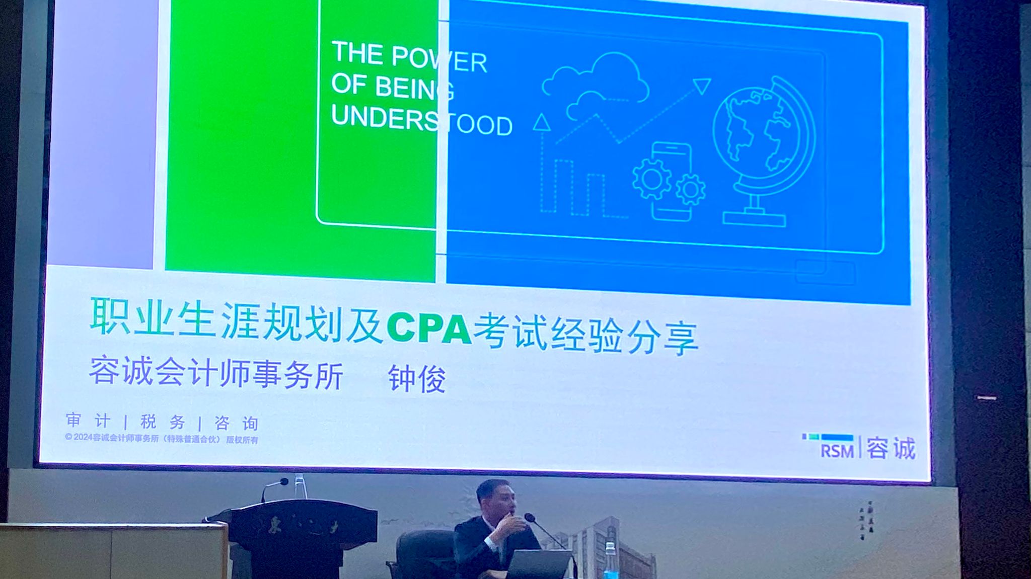 2024年11月6日晚19:00,PA视讯于南区202报告厅成功举办了一场以《职业生涯规划及CPA考试经验分享》为主题的讲座,旨在提升同学们的职业生涯规划意识,助力其合理规划老员工活。本次讲座特邀中国注册会计师、容诚会计师事务所业务合伙人、内核委员会委员钟俊先生主讲, ACCA、国会、CMA专业全体同学参与。