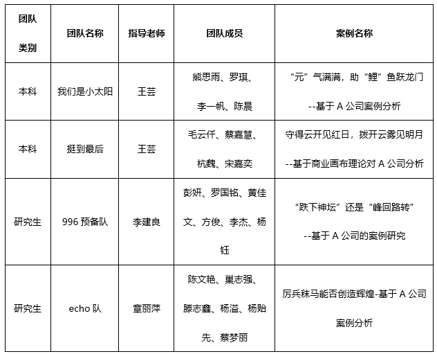 通过参加本届案例大赛,同学们受益良多,加强了同学们的团队协作精神;拓宽了同学们获取知识的途径,并学以致用;培养了同学们发现、分析、解决企业实际问题的能力,从而促进了同学们综合素养的提高。希望各个参赛队再接再厉,力争取得更好的成绩。