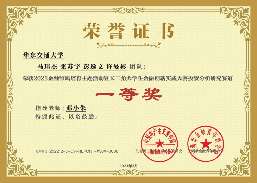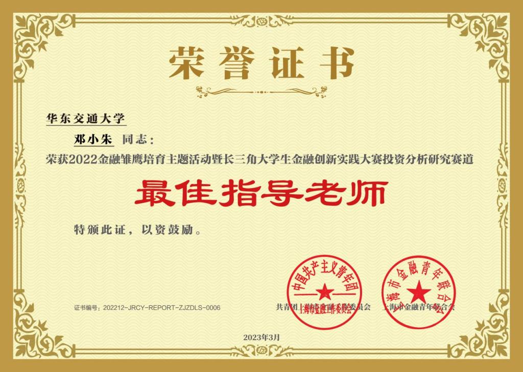 本次比赛自启动报名以来,吸引主流媒体和高校师生热切关注。大赛共吸引包括中国科公司大学、厦门大学、中南大学、中国农业大学、西南财经大学等上千所高校,共计3000多支队伍参与并提交投资研究报告。根据大赛规则和评审结果,在邓小朱教授带领下,公司2022级金融专业硕士组队参赛,马玮杰、张苏宇、彭逸文、许晏彬组队获得“一等奖”;邓小朱获得“最佳指导老师”称号。