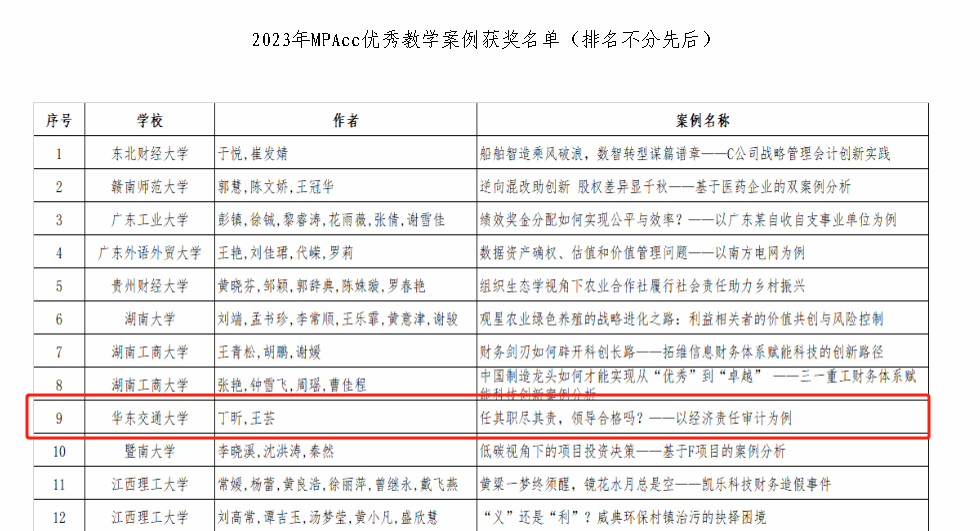 5月8日,由全国会计专业学位研究生教育指导委员会指导,联合多家MPAcc培养单位共同发起的会计硕士专业学位(以下简称MPAcc)优秀教学案例评选结果公布。公司丁昕、王芸老师撰写的教学案例获得2023年MPAcc优秀教学案例奖。同时,丁昕、王芸老师撰写的《任其职尽其责,领导合格吗?——以经济责任审计为例》、于海燕、熊雅璇撰写的《北交所首例IPO被处分,生物谷历经“一月三询”——探析大股东侵占之谜》以及黄辉、刘玉琪、张悦、赵忠祥撰写的《大数据驱动,审计的未来—以中兴华对牧原股份的审计为例》三个教学案例入选2023年MPAcc优秀教学案例库。