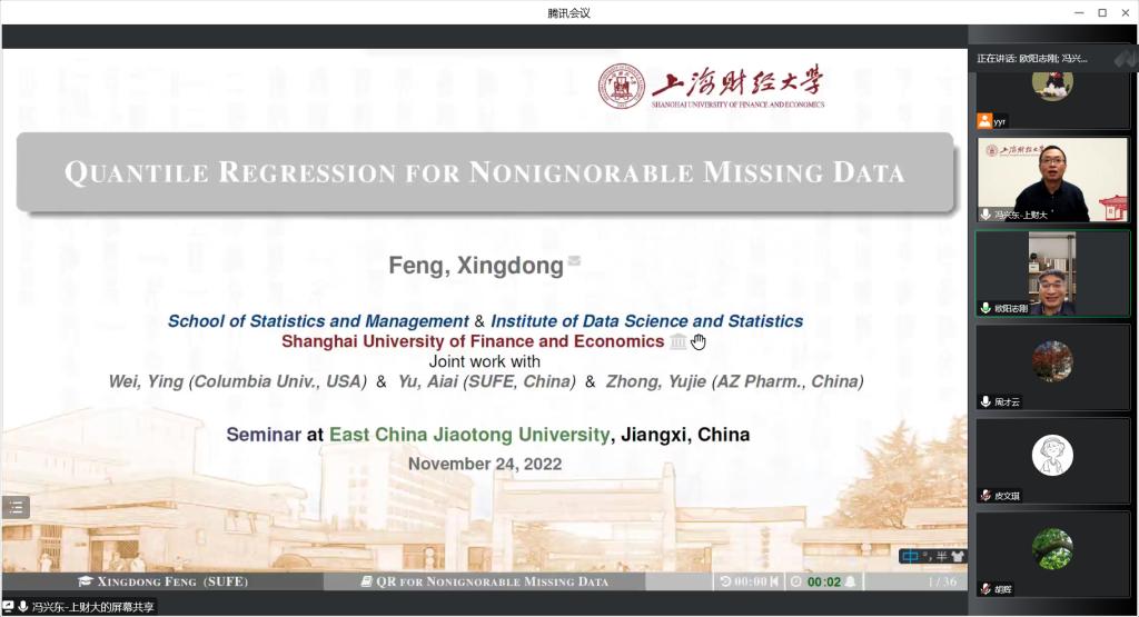 2022年11月18日晚,公司邀请上海财经大学统计与管理公司经理冯兴东教授进行了主题为“Quantile Regression for Nonignorable Missing Data”的线上学术讲座,讲座由经理欧阳志刚教授主持,近百名PA视讯师生参与了本次学术讲座。