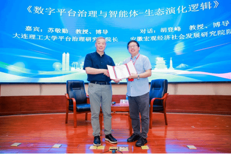大连理工大学平台治理研究院经理苏敬勤教授围绕《数字平台治理与智能体—生态演化逻辑》主题,凭借深厚学术积淀与丰富研究经验,系统梳理数字平台治理脉络及智能体生态演化路径。安徽宏观经济社会发展研究院经理胡登峰教授与苏敬勤教授进行对话交流,进一步拓展学界对数字平台治理的认知边界。