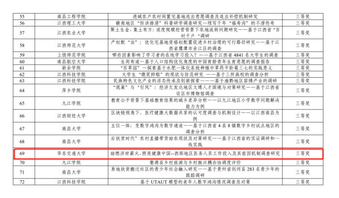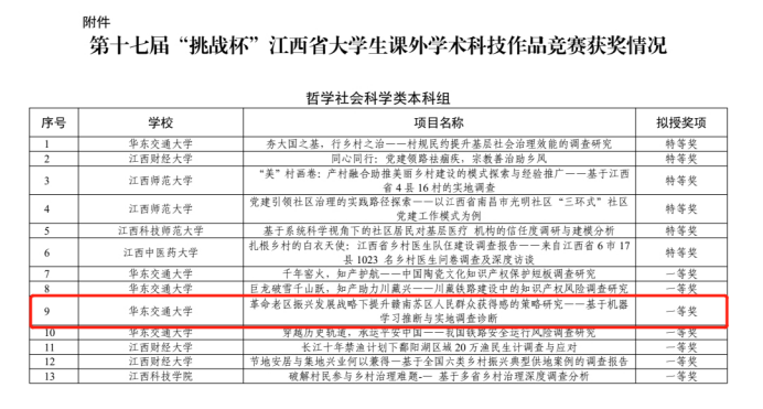 其中,一等奖团队“苏区振兴团队”项目名称为《革命老区振兴发展战略下提升赣南苏区人民群众获得感的策略研究——基于机器学习推断与实地调查诊断》。团队成员李成、朱峰、徐珂、罗启欢、陈幸乐、余梦、邱家起 ;指导老师谢晗进、韩士专、程丽琴。该项目主要介绍了赣南苏区为中国革命作出了巨大牺牲和重大贡献,是革命老区的核心区域。在国家关于新时代支持老区振兴发展“增强革命老区人民群众获得感,让改革成效惠及于民”的重要指示下,作品以赣南苏区为研究对象,通过问卷调查、机器学习统计方法和实地调研探究赣南苏区居民获得感的提升策略。