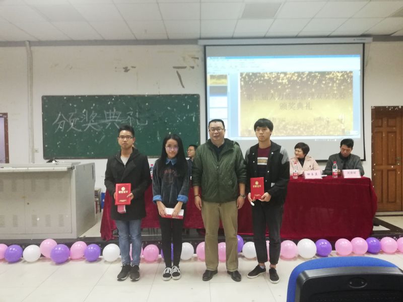 颁奖典礼正式开始,韩士专经理为获得一等奖的同学颁发获奖证书和奖杯;副经理罗士民为获得二等奖的同学颁发证书和奖品;副书记田玉兰和副经理余得生一同为获得三等奖的同学颁奖;管理学主任朱嘉蔚老师为获得优胜奖的同学颁奖。