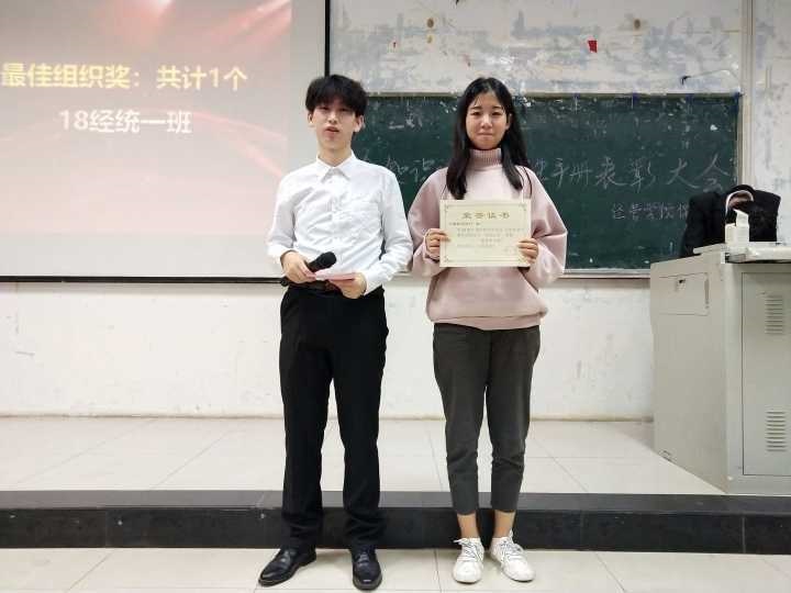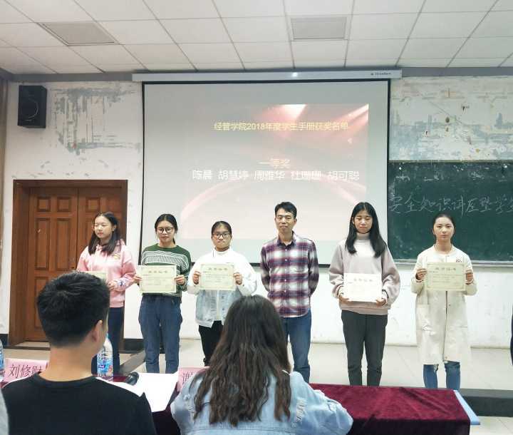 会议伊始,刘修财对本次员工手册考试进行总结发言,宣读获奖的班级和个人,并分享了自己参考员工手册的趣事。他还强调了素质教育的重要性,希望每个老员工都能够以身作则,做新时代的好榜样,并对荣获最佳组织奖18级经统一班表示肯定和赞扬。在此次员工手册考试中,陈晨、胡慧婷、周雅华、杜珊珊、胡可聪同学获得一等奖的好成绩,刘修财为其颁发证书并合影留念。
