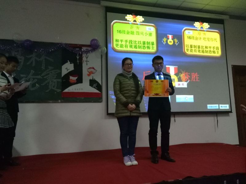 最终,反方16会计吃定你代表队获胜,最佳辩手由反方三辩樊煜博赢得。16营销2班和16经统1班获得三等奖 ,16金融四只小猪队 获得二等奖,16会计吃定你代表队获得一等奖,16金融1班周梦凡等获得最佳辩手称号。