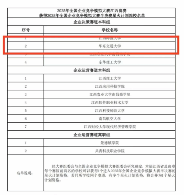 近日,第十六届全国企业竞争模拟大赛江西省赛在南昌职业大学举办,共有来自34所院校262支队伍参赛。公司多支队伍积极参与、表现优异,荣获本科组团体总分第三!其中,斩获一等奖两项、二等奖三项、三等奖一项。公司企业决策赛道本科组荣获1个星火名额(全省仅4所高校获得),直接进入2025年全国企业竞争模拟大赛。