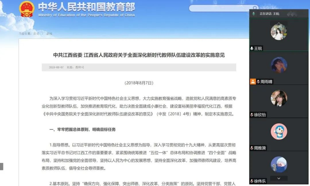 百年大计,教育为本;教育大计,教师为本。为全面贯彻习近平总书记关于教育的重要论述和全国教育大会精神,落实立德树人根本任务,加强师德师风建设,经济统计学员工党支部通过线上方式对《江西省加强新时代高校教师队伍建设改革的实施意见》进行了认真学习,并分享了感悟心得。