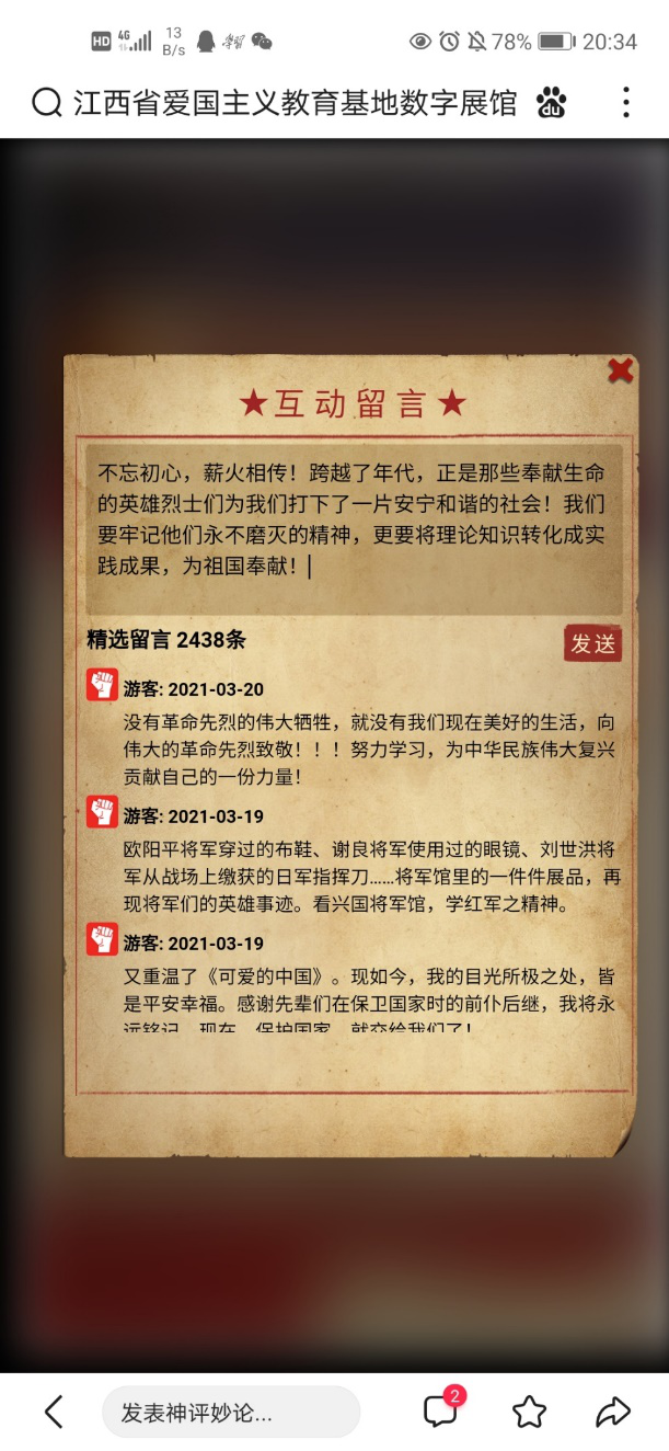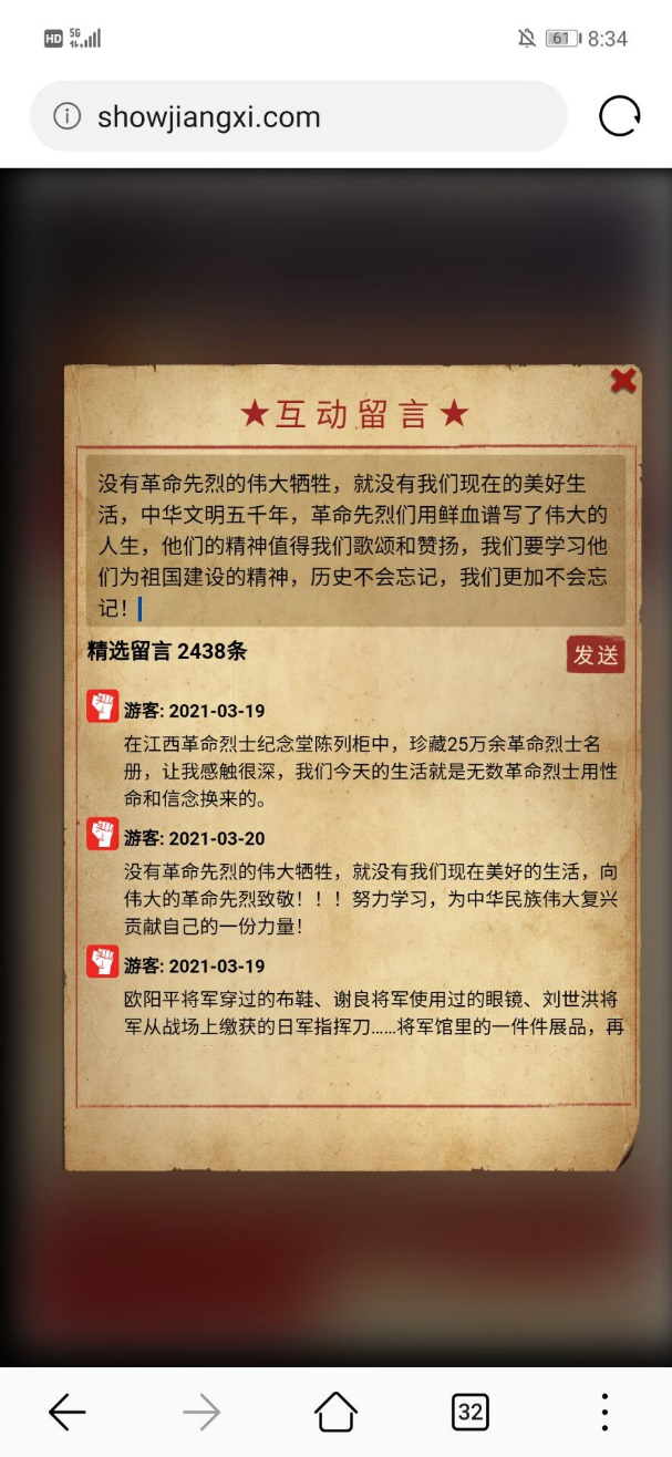 互动留言。通过互动留言的方式缅怀革命先烈,传承红色基因。不断夯实中华儿女的精神力量,增强对党史教育的政治认同感、归属感和自豪感,永担不忘初心牢记使命的时代责任。