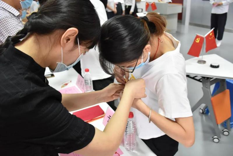 老党员为新党员佩戴党徽