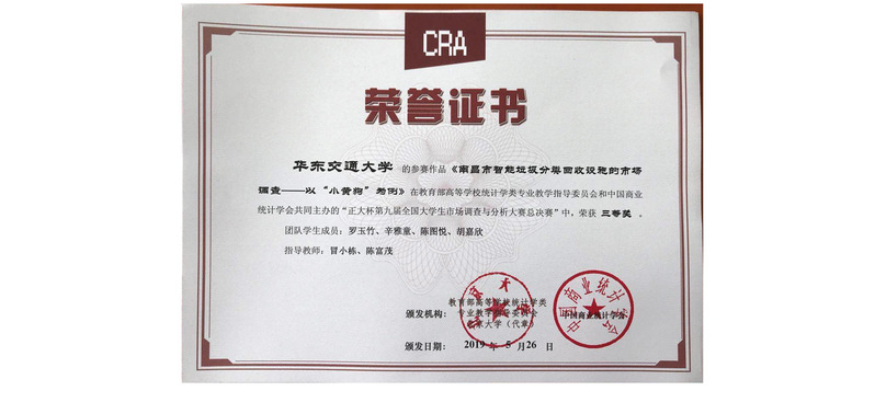 由16经统罗玉竹、辛雅童、陈图悦、胡嘉欣四位同学撰写,冒小栋、陈富茂两位老师指导的《南昌市智能垃圾分类回收设施的市场调查》调查报告获得“正大杯”第九届全国老员工市场调查与分析大赛三等奖。