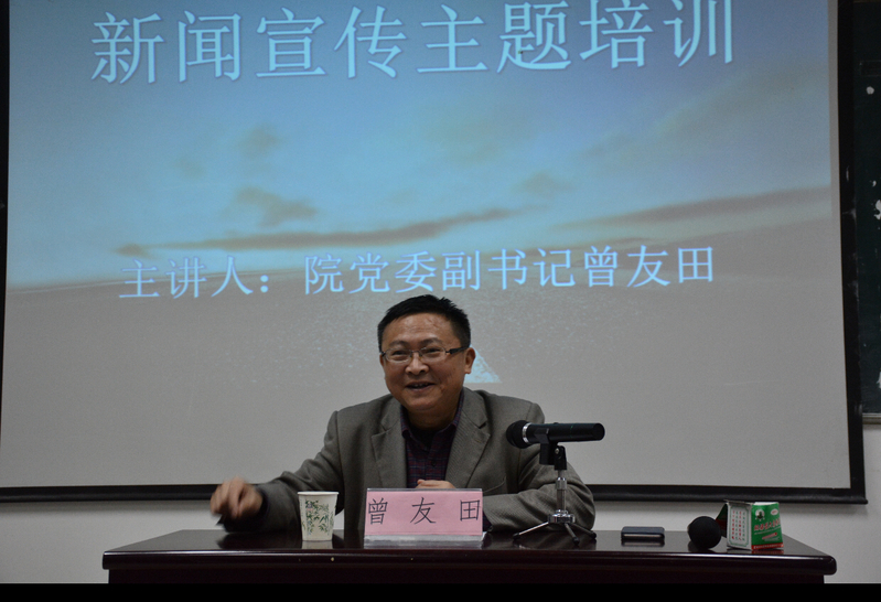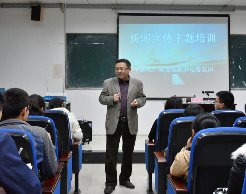 尽管寒风凛冽,634教室内洋溢着温暖的气息。晚7点左右,热情高涨的同学们已陆续到达会场等待曾友田的到来。学工处主任刘修财在讲座开始前强调了新闻写作的重要性并向同学们提出了认真领会讲座内容的要求。曾友田利用自己的休息时间,为讲座做了精心的准备,仔细而详尽地向员工骨干们讲述了如何做好新闻宣传工作。