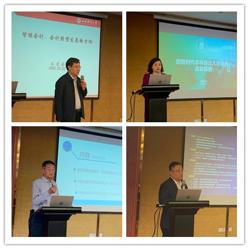 山东财经大学会计公司经理王爱国、华中农业大学PA视讯会计系主任包晓岚、原中南财经政法大学经济管理实验教学中心主任毛志山、浪潮铸远教育科技有限公司总经理马建军分别作了《智能会计:会计转型发展的方向》、《本科会计人才培养改革探索》、《对国家虚拟仿真实验教学一流课程建设的认识与实践课程建设的认识与实践》、《数智时代企业大数据人才培养方案设计与探讨》的主题演讲。